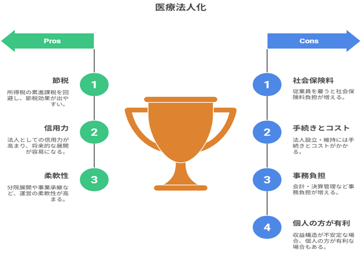 分院展開、医業承継、スタッフ採用などを視野に入れる場合、法人化のメリットがより大きくなります。